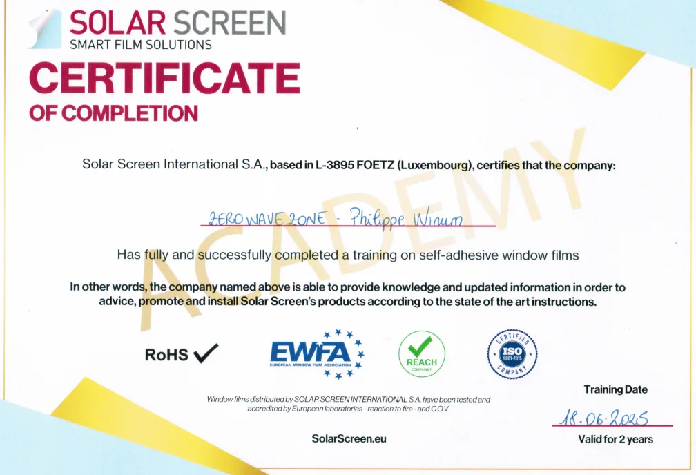 Cette recommandation d’un expert reconnu dans le domaine de la protection électromagnétique nous a naturellement orientés vers Solar Screen. Après avoir testé et validé les performances exceptionnelles de leurs films, ZeroWaveZone a décidé de devenir distributeur officiel en France et poseur agréé de ces solutions innovantes.