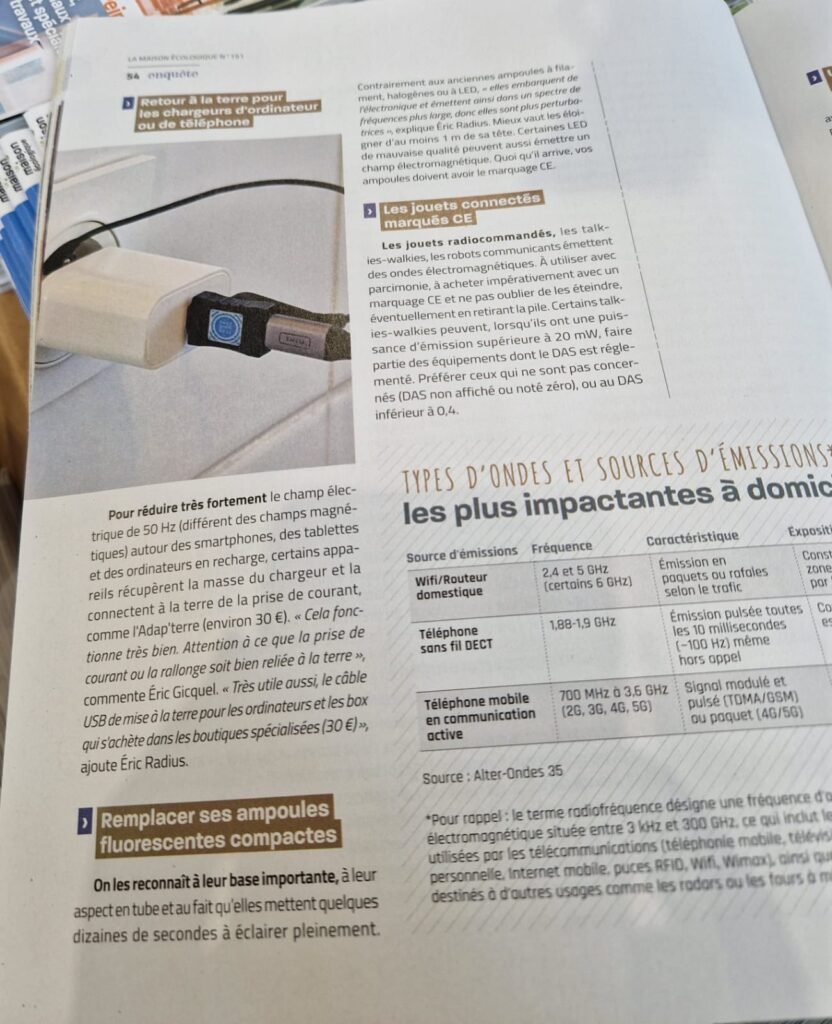 Cette parution est complètement spontanée et non sollicitée. Dans la section dédiée aux chargeurs USB (ordinateurs, téléphones), l’article explique les risques des champs électriques 50 Hz émis par les appareils en charge et présente l’Adap’terre® comme solution pratique de mise à la terre.